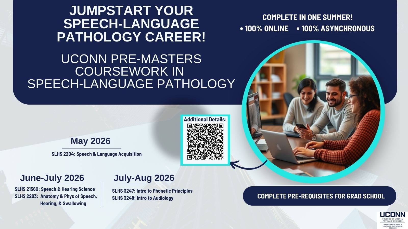 Title says, "Jumpstart your speech-language pathology career" with "UConn pre-masters in speech-language pathology" written below. Graphic includes summer course dates and QR for website.